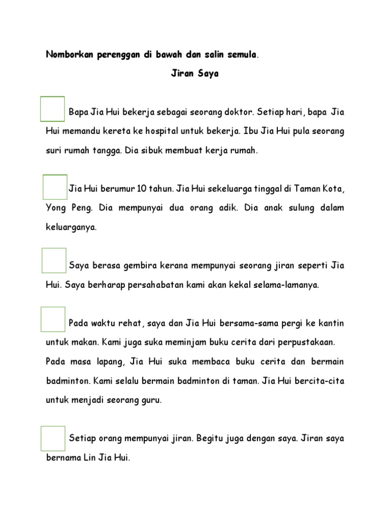 Hobi saya ialah bermain badminton. JIRAN BARU SAYA Aiman dan amir tinggal di Tamn Kenanga. Berhubung dengan perkara di atas saya Nurul Afiqah Bt.